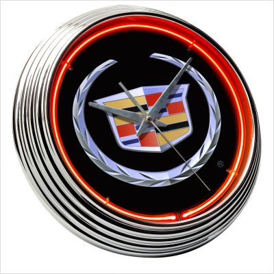 On The Edge Cadillac Crest Neon Clock is designed to keep track of the time as well as to boost up the garage, game room, bar, saloon or office with its stylish look. It features a radiant neon light ring that lines the inner ring of the clock and can be turned on or off with an effortless flick of a switch. This neon clock offers an adaptor and battery that are included to run the quartz clock movement.